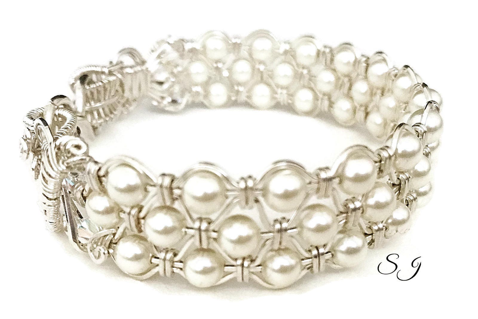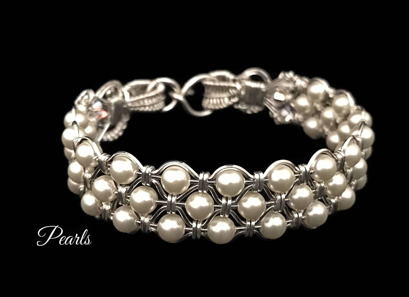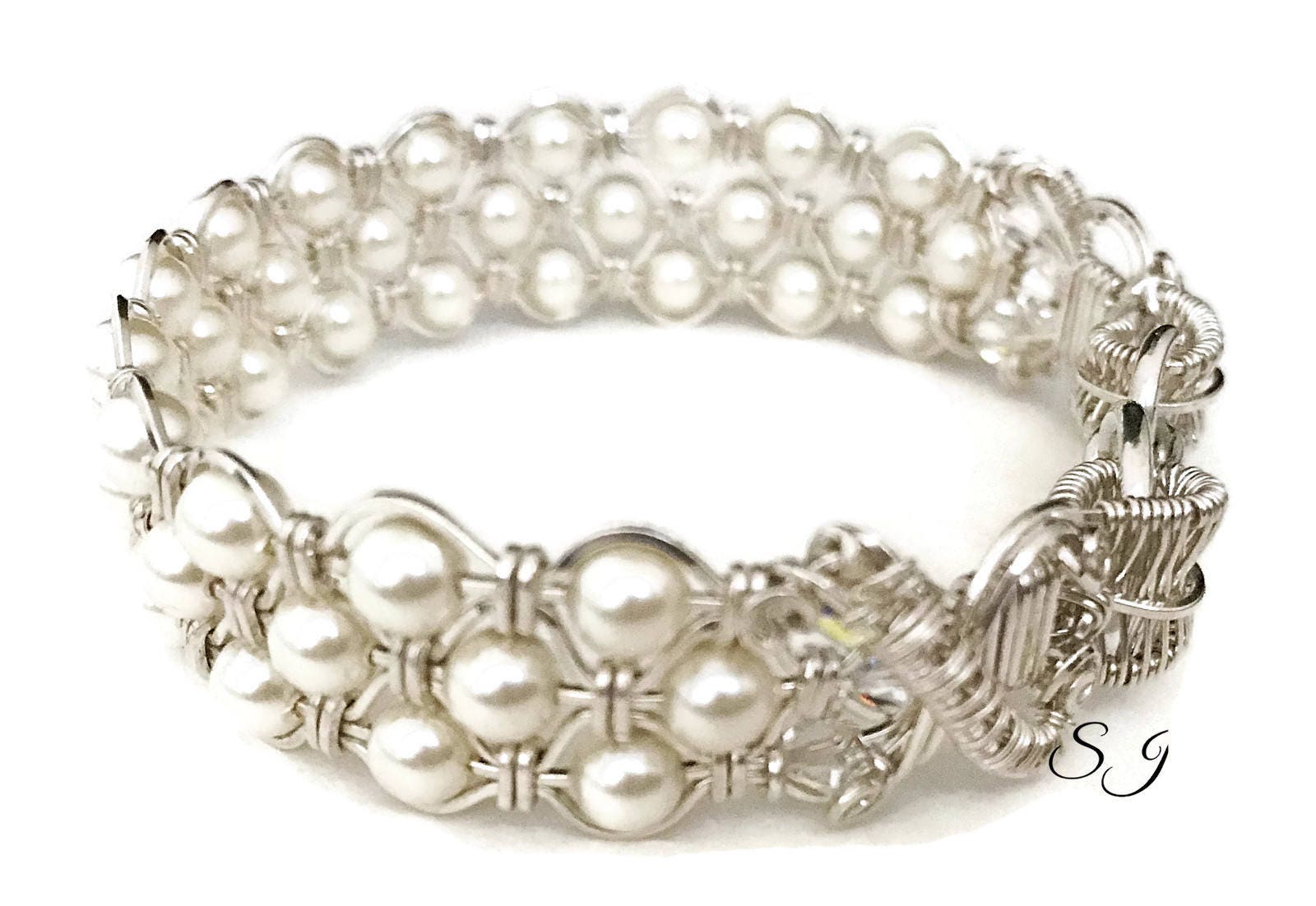Each high-quality Swarovski crystal pearl was woven into the band of this bracelet by hand in high-quality .925 sterling silver wire. The ends of this bracelet was designed and sculpted with two things in mind, beauty and security. I added a heavy duty hook and eye clasp for the final finish. It snaps for a secure lock.