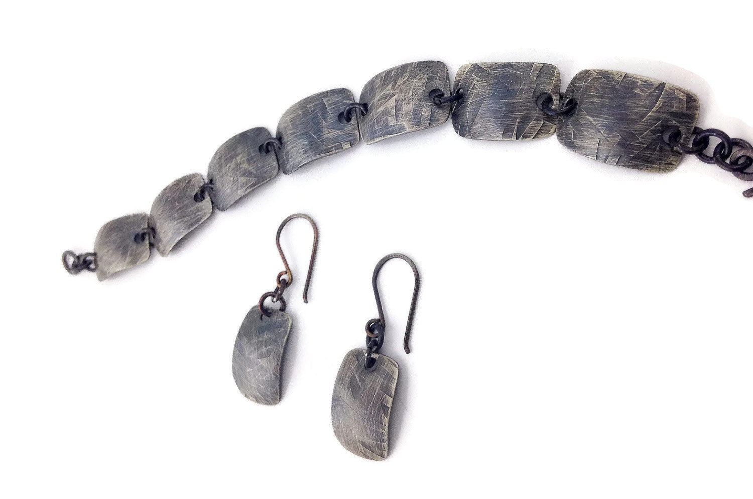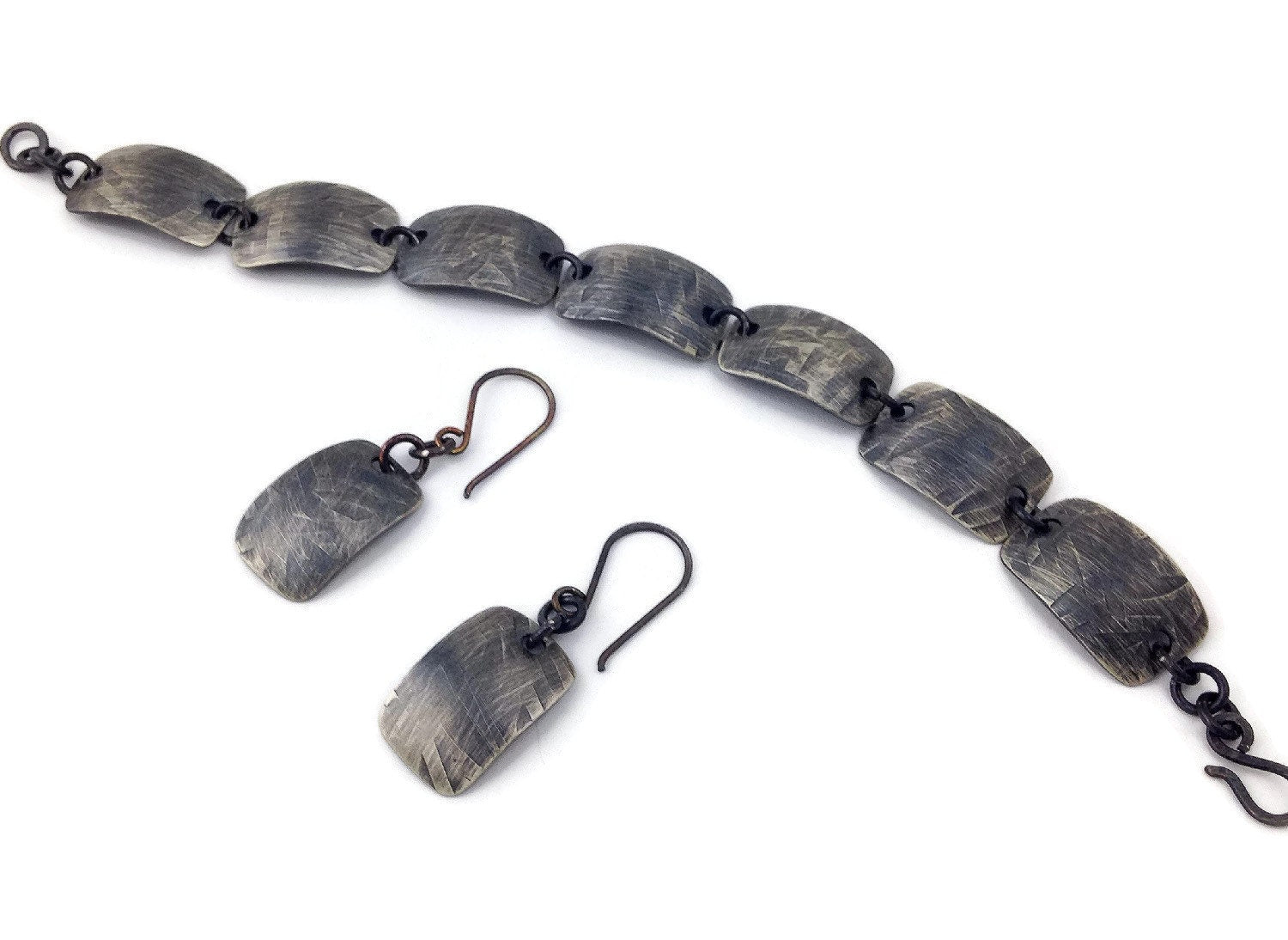 This Handmade Designer sterling silver bracelet and earring set was created by hand with solid .925 Sterling silver(one of the Metals of Antiquity). We designed, textured and shaped it in a Boho style and then for the finally we gave it a nice patina to highlight the leaf/grass design.